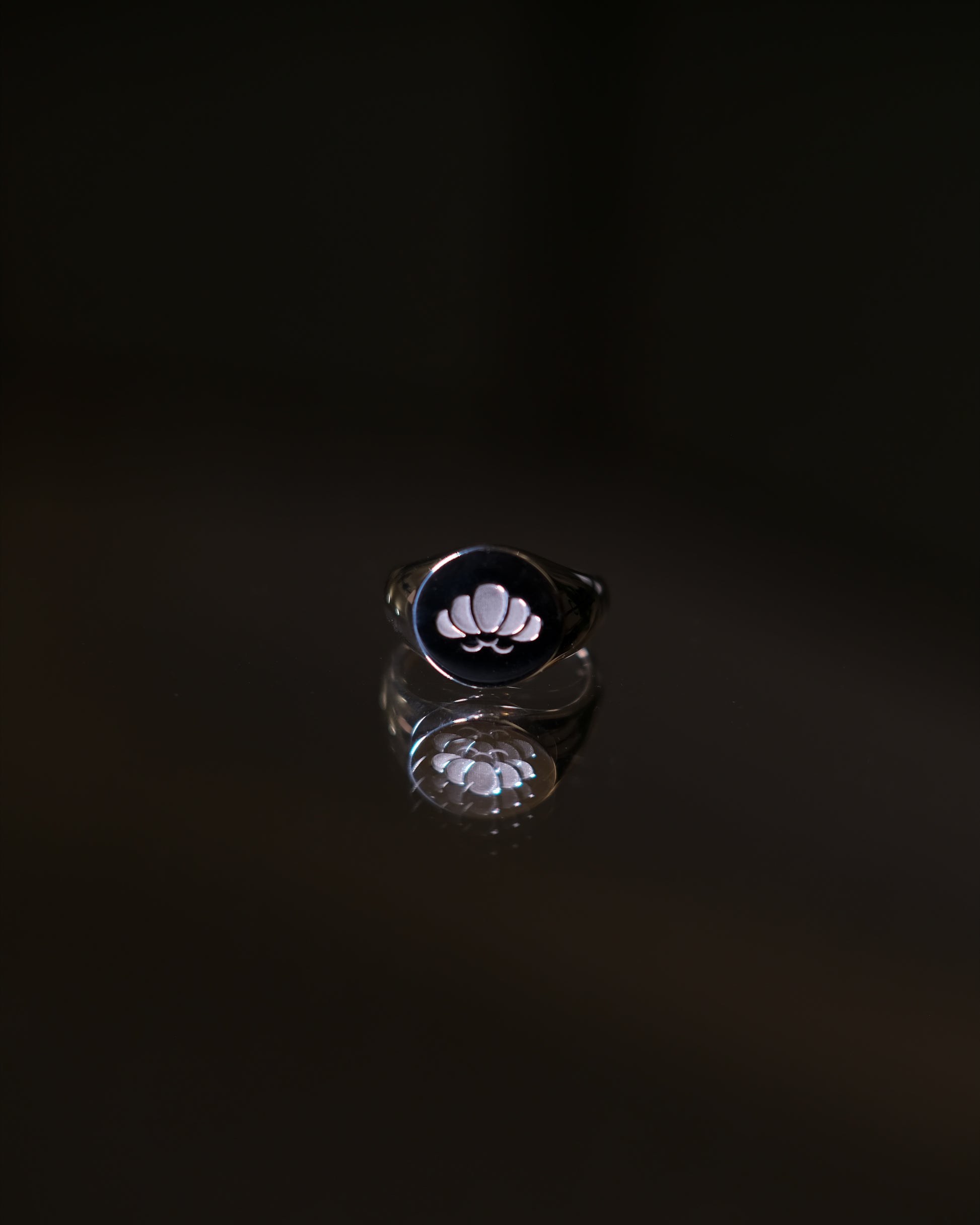 まん丸な印台に沿って、スムーズなカーブで表現した五葉を配置。シンプルで優しい印象もありますが、シンメトリーなこのデザインは洗礼さを際立たせています。